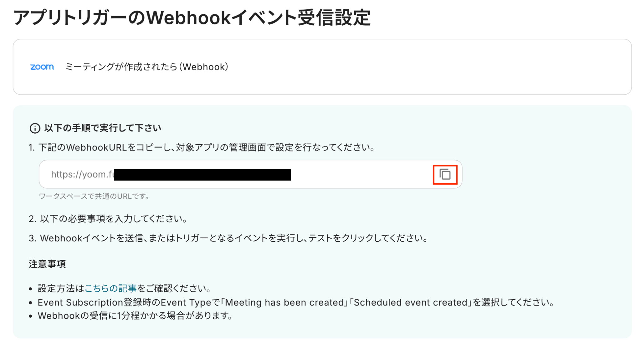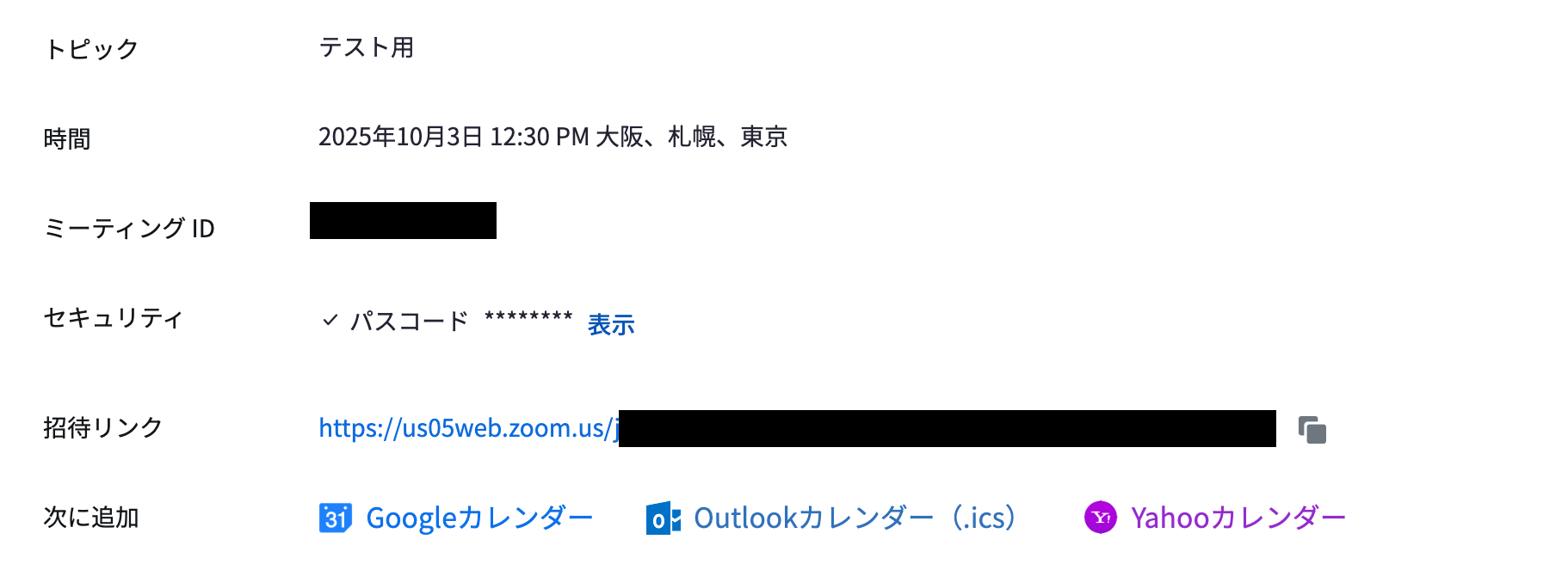 Webhookの設定後、テスト用にZoomミーティングを作成しましょう。