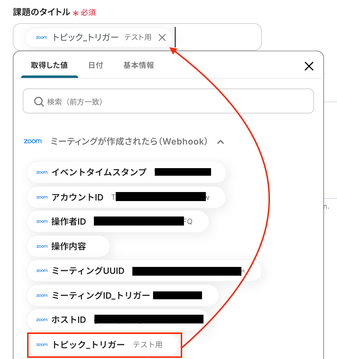 「課題のタイトル」:入力欄をクリックして表示される取得した値を引用してください。