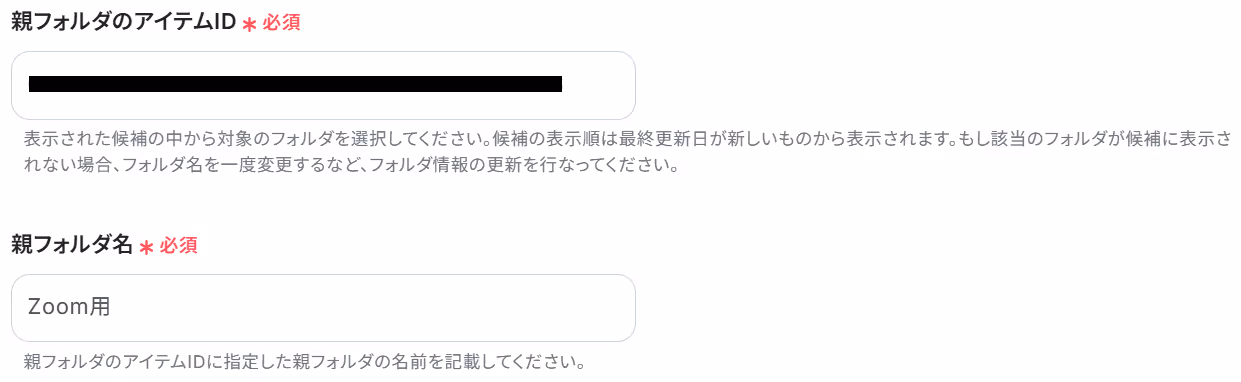 続いて「親フォルダ名」に先ほど指定した親フォルダの名称(今回でいうと「Zoom用」)を入力してください。