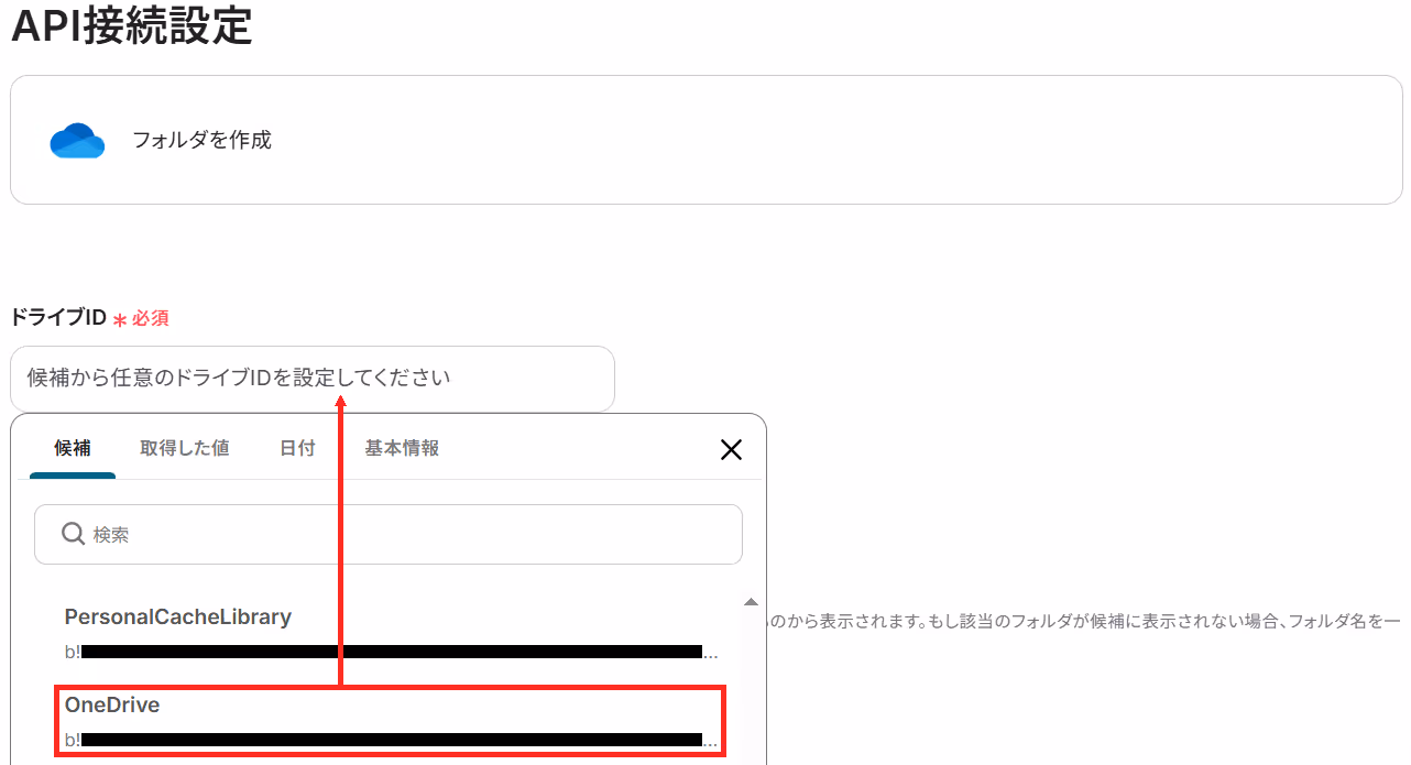 API接続設定に移るので、まず「ドライブID」を候補から選択してください。