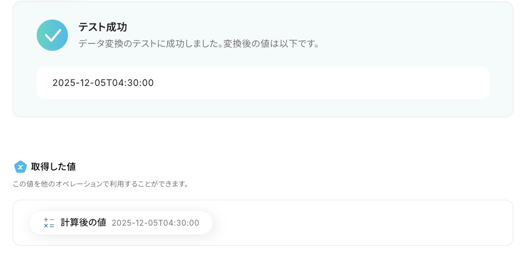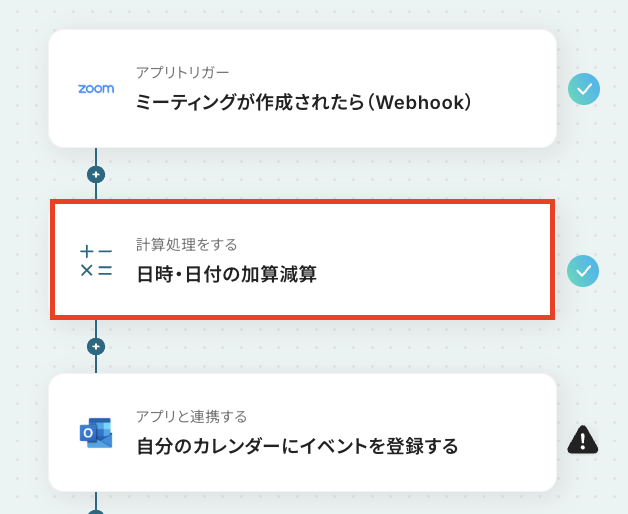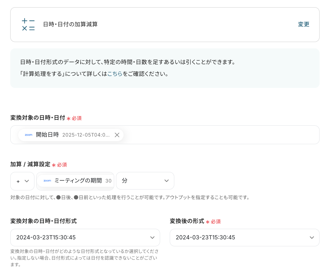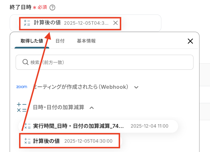 - 続いて、オペレーションの「計算処理」を活用し、Zoomから取得したミーティングの情報をもとに予定終了日時を割り出します。