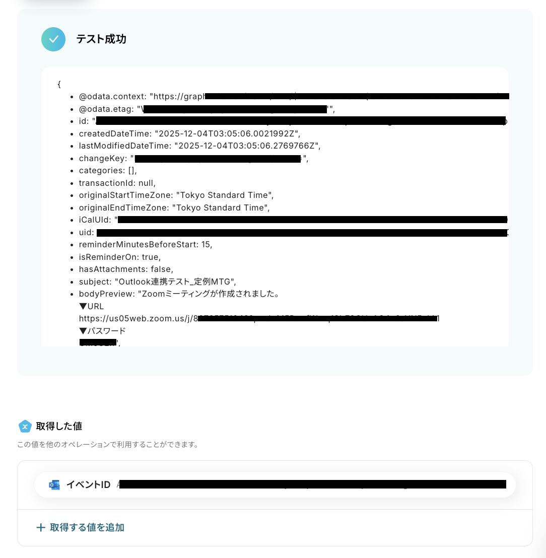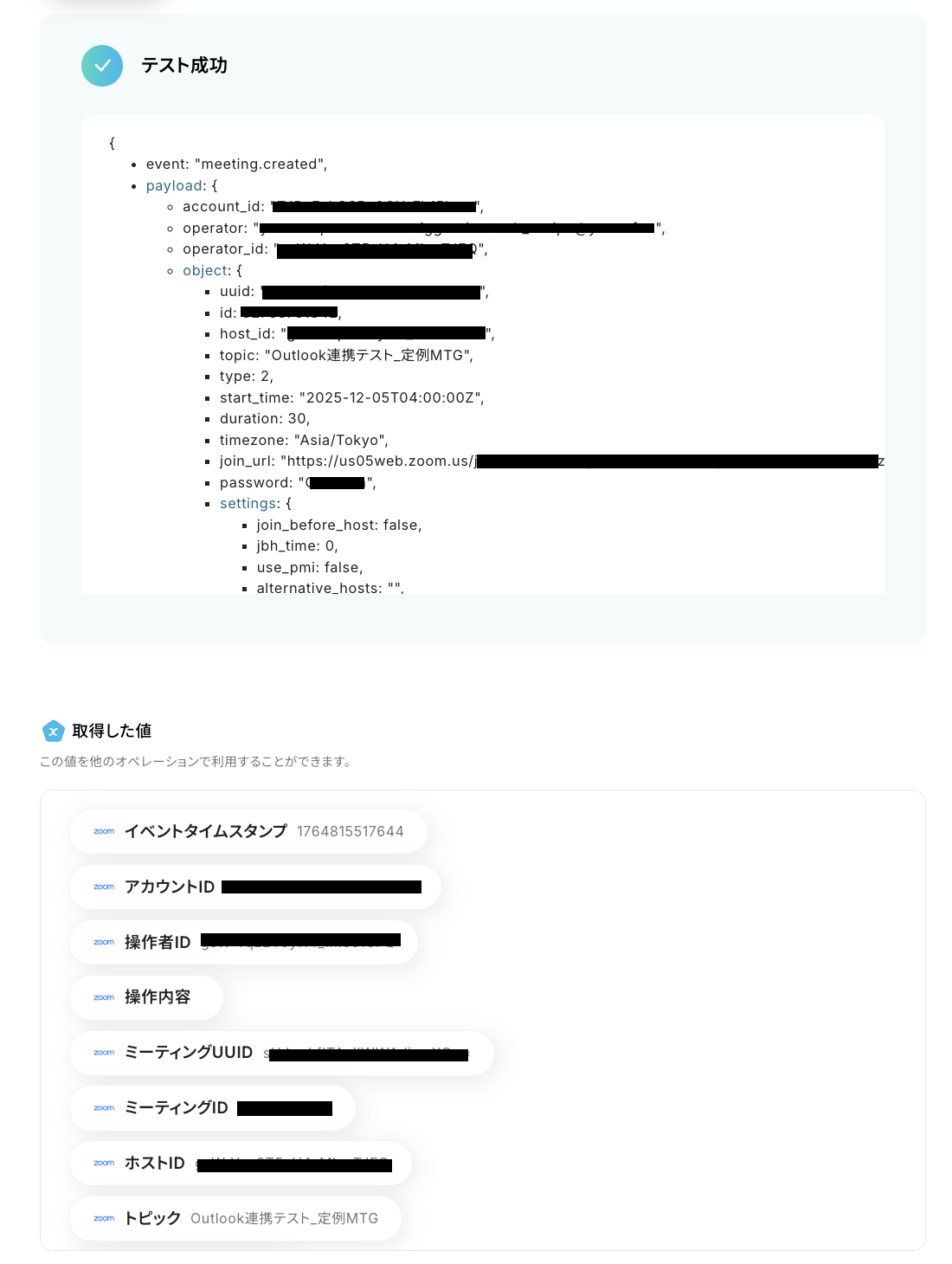 - Zoomの「ミーティングのレコーディング情報を取得する」アクションでは、ミーティングIDにトリガーで取得した値を設定してください。