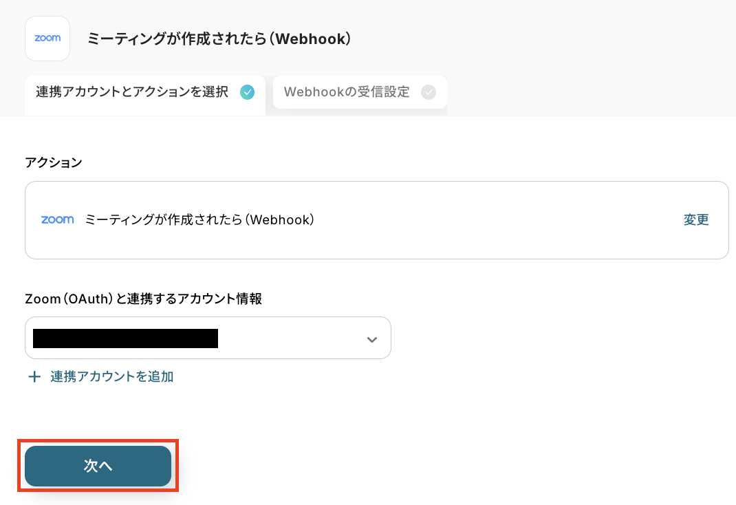 - 次に、トリガーでZoomを選択し、「ミーティングが作成されたら」というアクションを設定します。