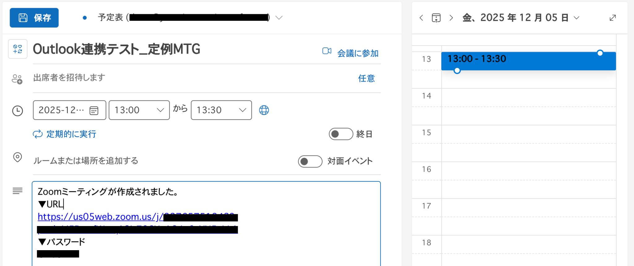 - Zoomでミーティングを作成するだけでOutlookへ自動でイベント登録されるため、手作業の時間を短縮できます。