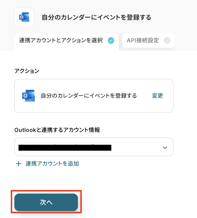 - 最後に、オペレーションでOutlookを選択し、「自分のカレンダーにイベントを登録する」アクションを設定し、前のステップで整えた情報を連携します。