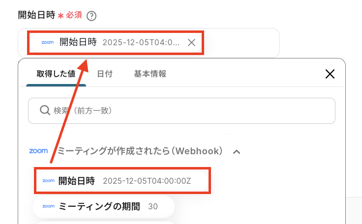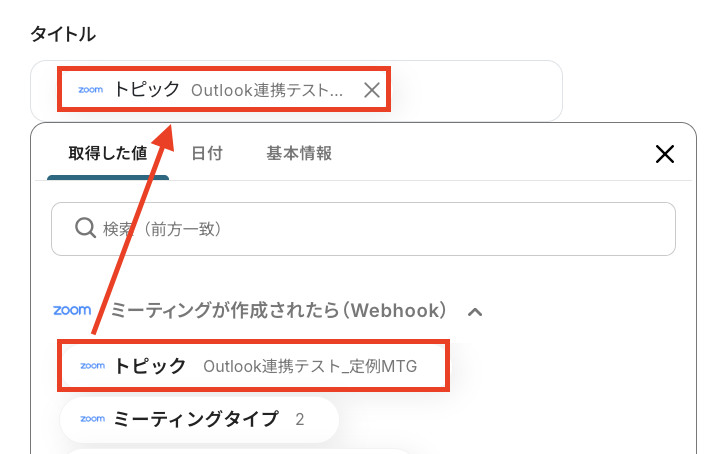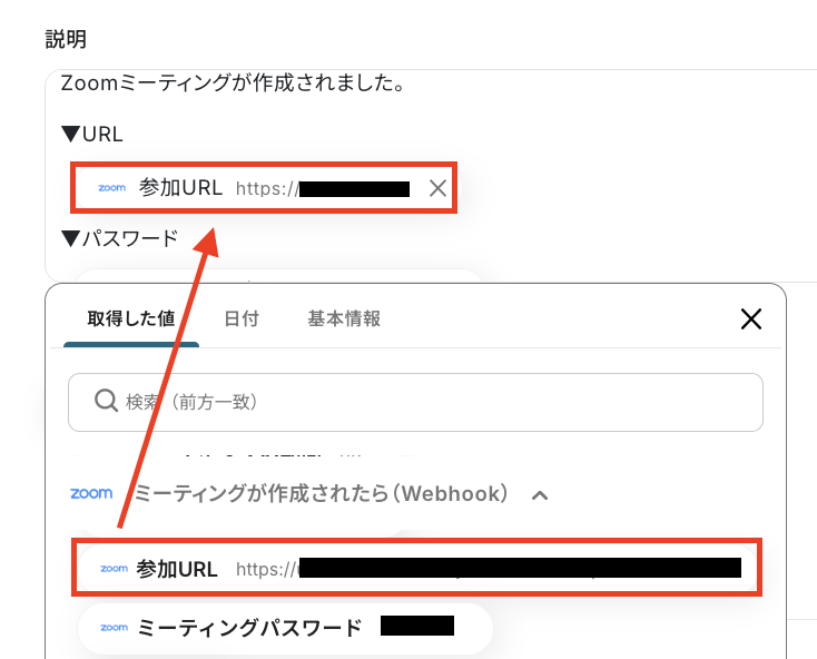 - Zoomの「ミーティングを作成」アクションでは、ミーティングのトピックやパスワードなどを固定値で設定したり、前段で取得したデータを動的な値として使用するなどのカスタムが可能です。