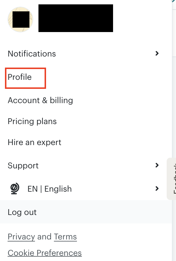 Mailchimpのホーム画面右上のアイコンマークをクリックし、「Profile」を選択します。