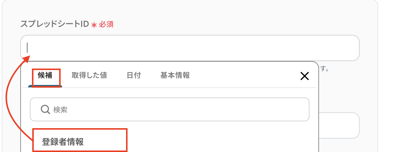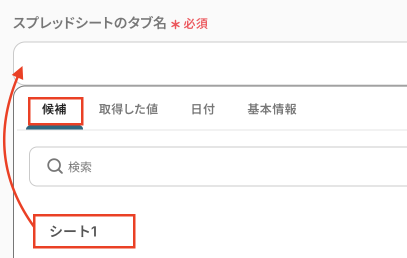 スプレッドシートのタブ名も同様に候補から選択してください。