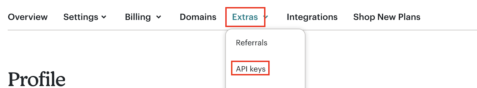 「Extras」を選択し、「API keys」をクリックし、API keysをコピーしYoomのMailChimpのAPI keysにペーストしましょう。