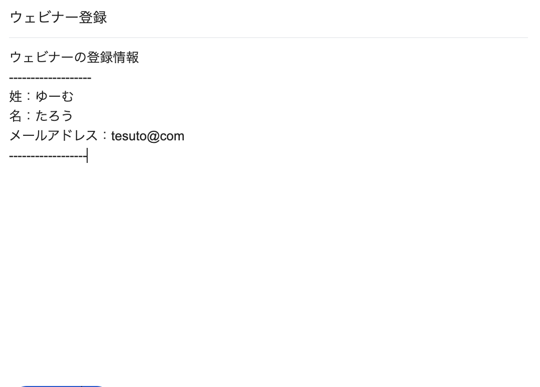 設定後、添付画像のように設定したキーワードを件名に入力し、本文はZoomのウェビナー登録に必要な「姓」「名」「メールアドレス」を記載したメールをOutlookのアドレスに送信しましょう。