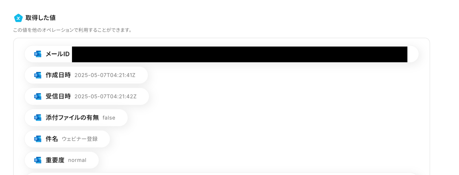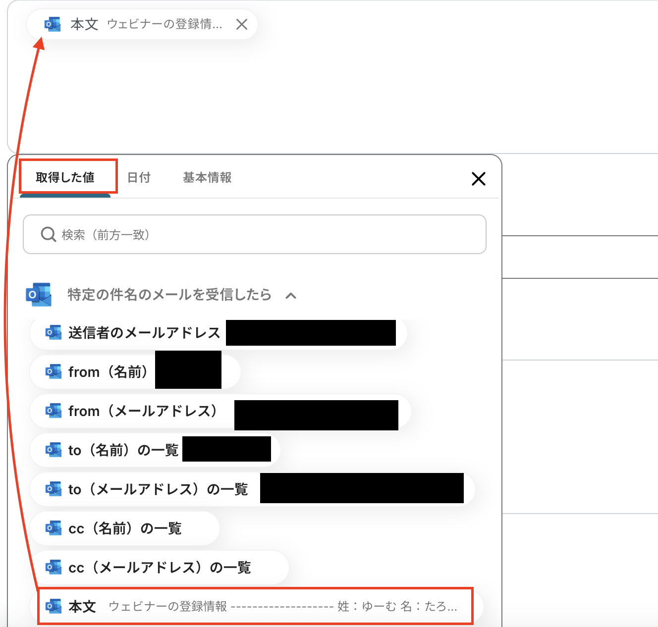 対象のテキストはOutlookの取得した値から「本文」を選択してください。