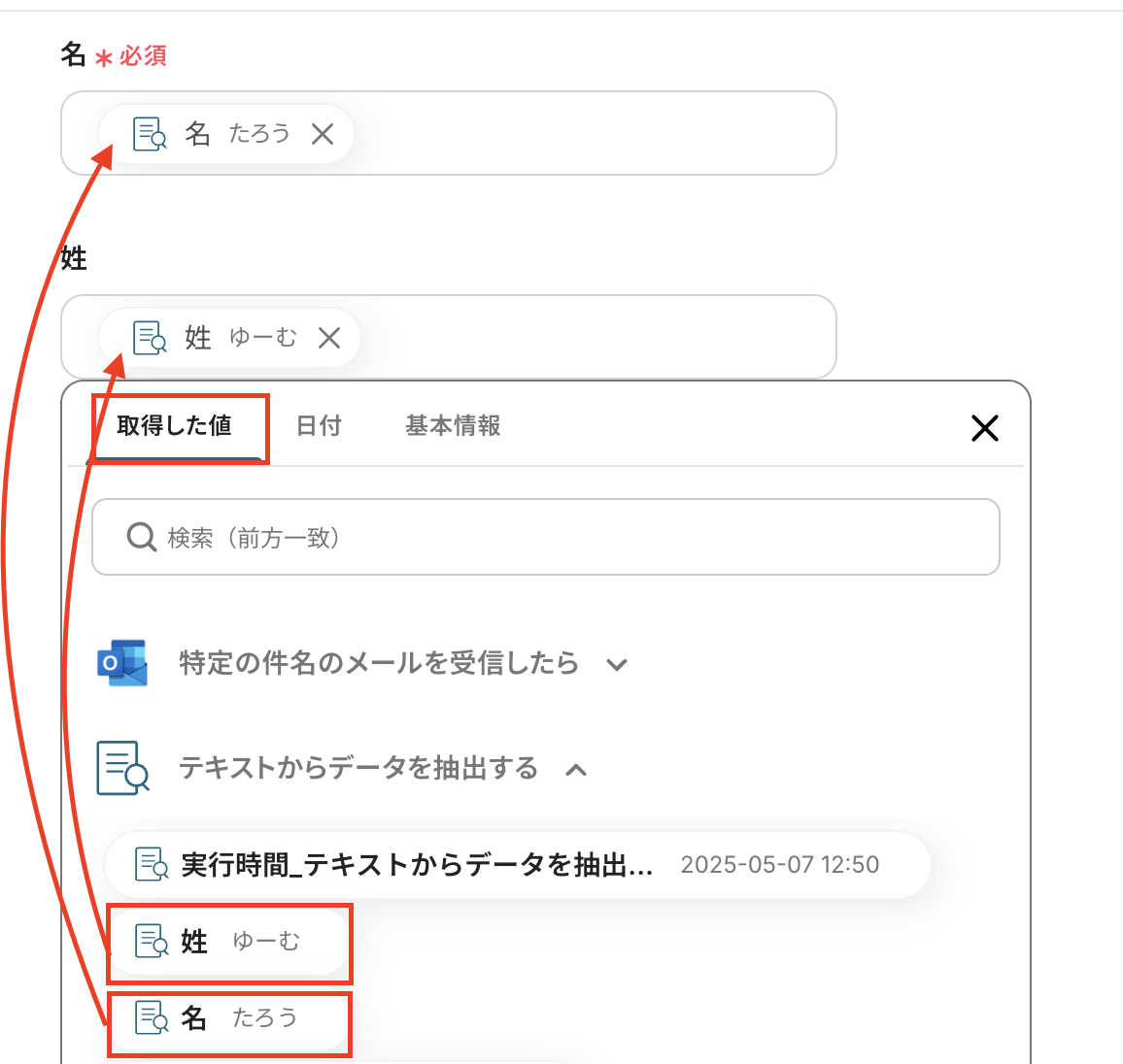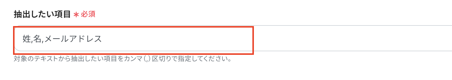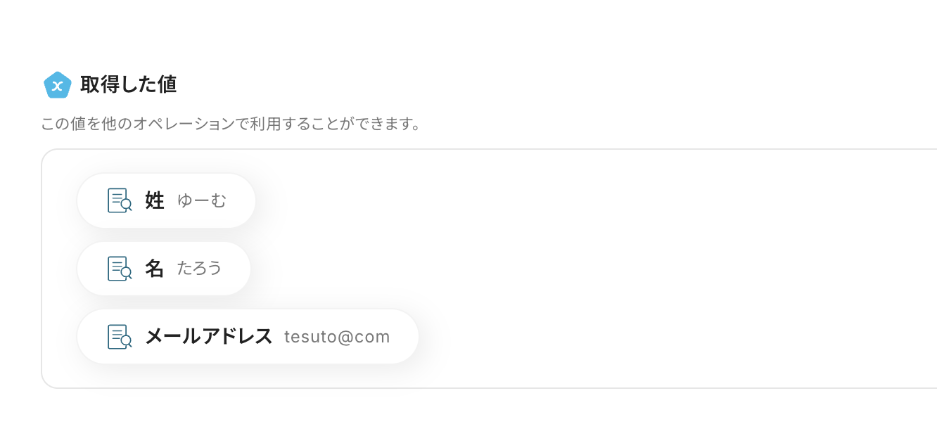 「名」「姓」「メールアドレス」は「テキストからデータを抽出」の取得した値から選択してください。