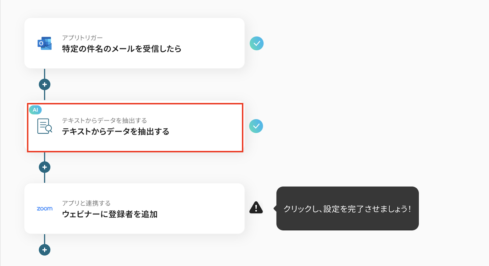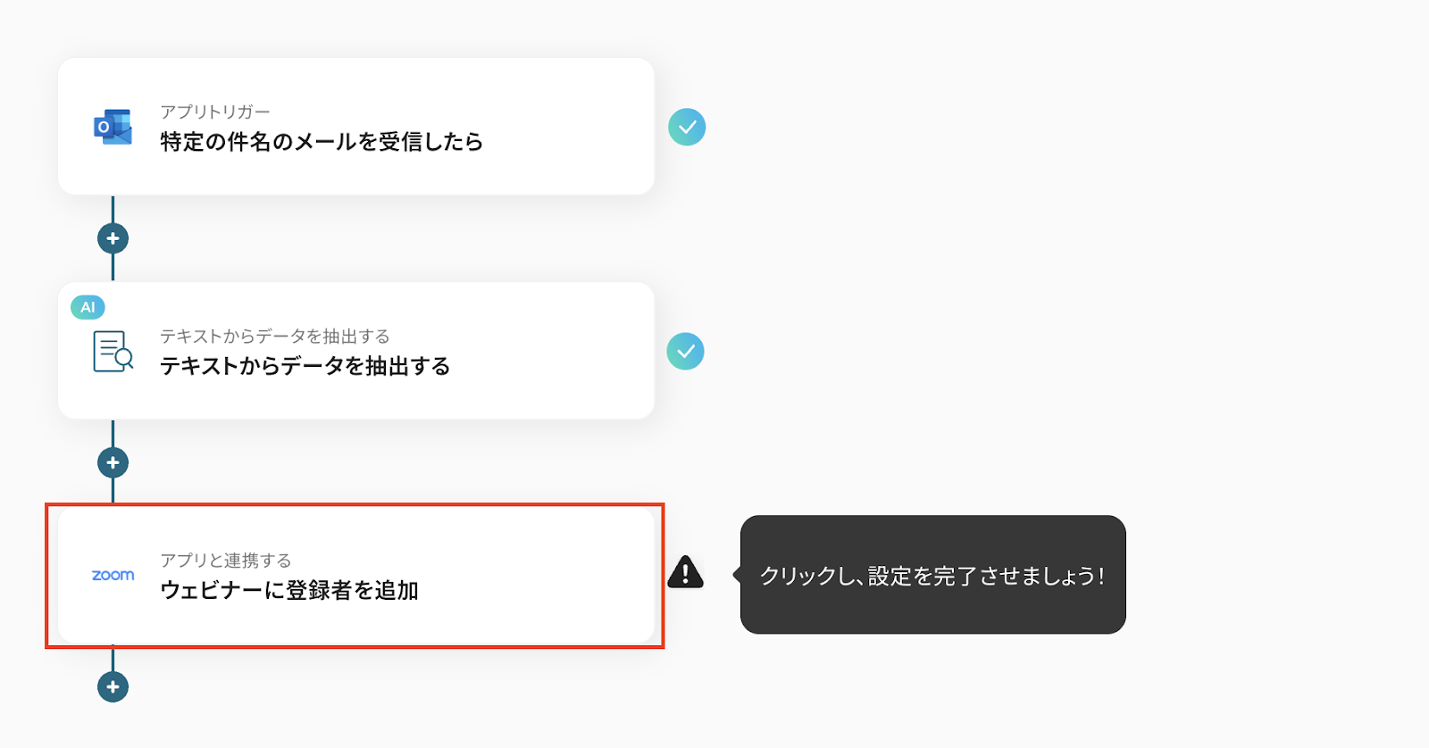 Outlookで受信した出欠連絡メールをトリガーとして、Zoomウェビナーへ自動的に参加者を登録したり、登録後に確認メールを送信したりする基本的な連携フローです。