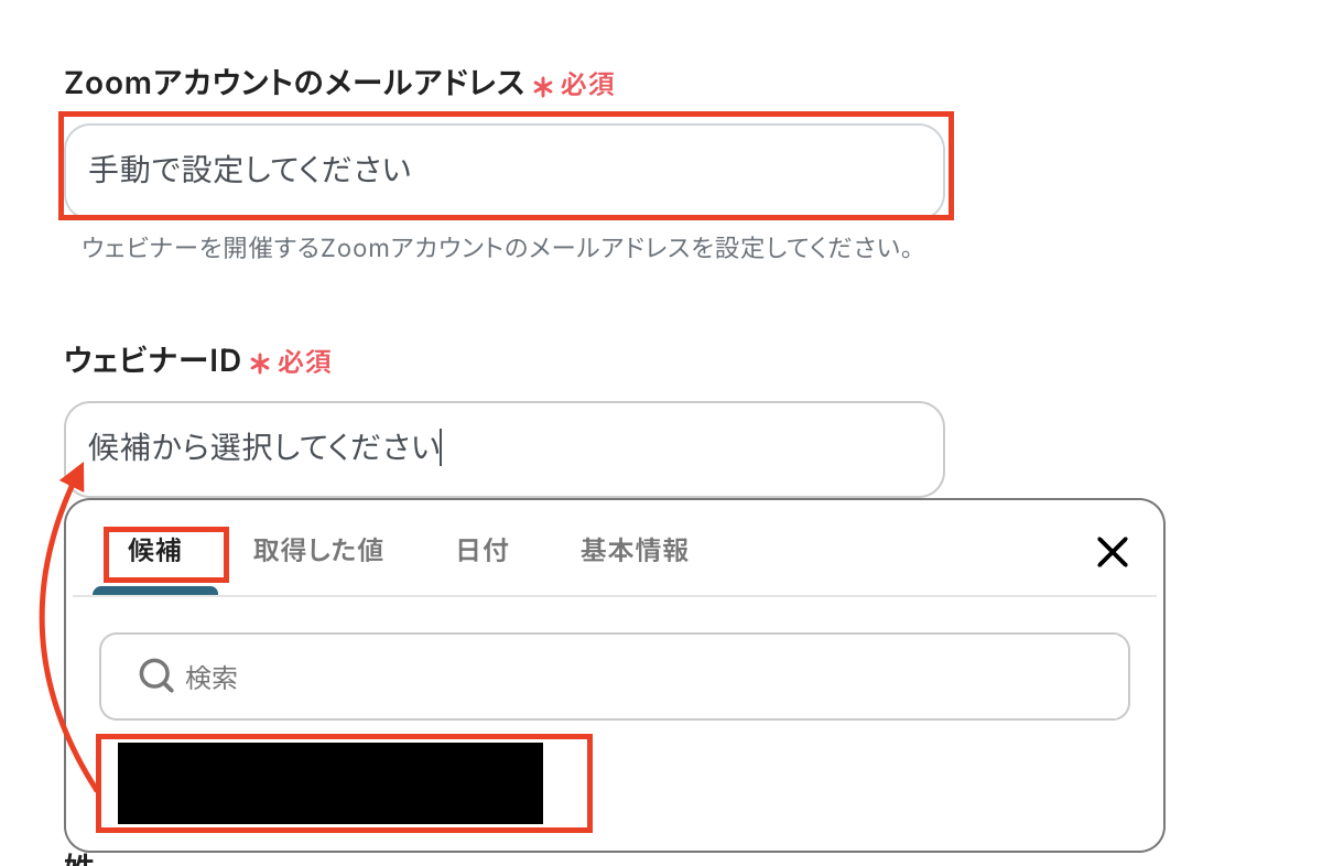 ウェビナーIDは候補から選択しましょう。