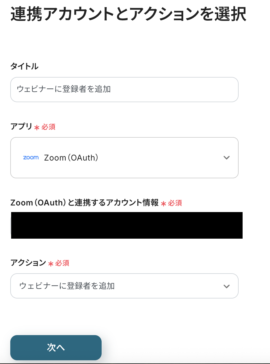 ここでは、Zoomのウェビナーを登録するアクションで必要な「姓」「名」「メールアドレス」を設定しました。