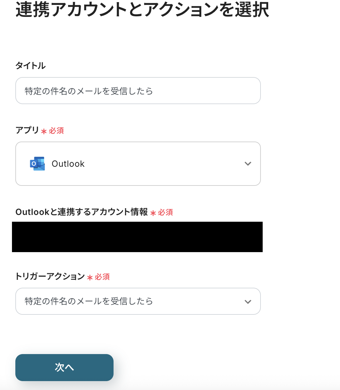 Outlookと連携するアカウント情報を確認して、トリガーアクションは変更せずに次に進みましょう。
