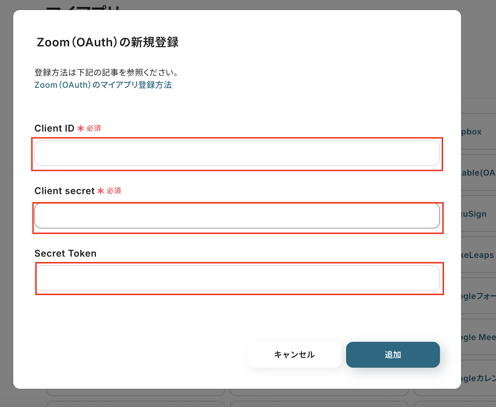 Client ID、Client secret、Secret TokenをZoomの管理画面から取得し、入力しましょう。
