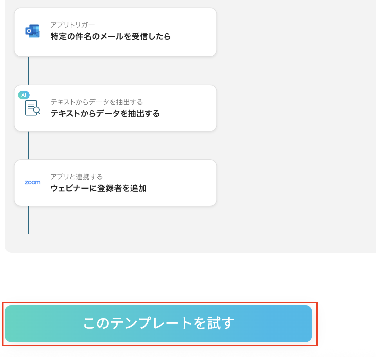 YoomにはOutlookで受信した出欠メールに基づきZoomウェビナーへ参加者を自動登録する業務フロー自動化のテンプレートが用意されています。