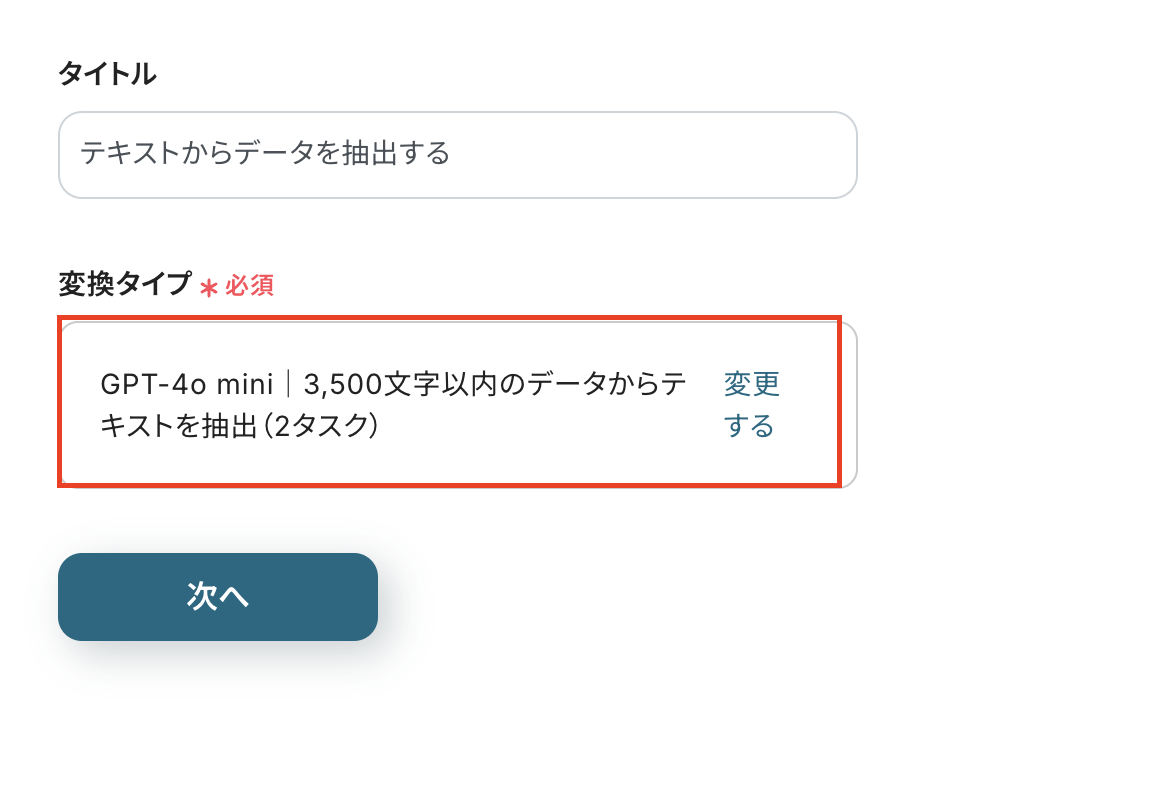 アクションは「3500文字以内のデータからテキストを抽出」が選択されていますが、文字数に応じて変更してください。