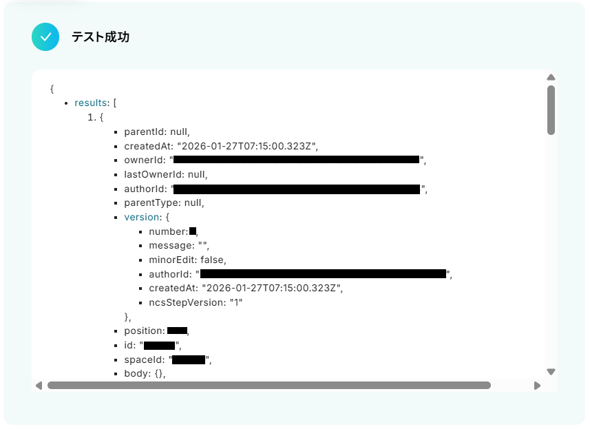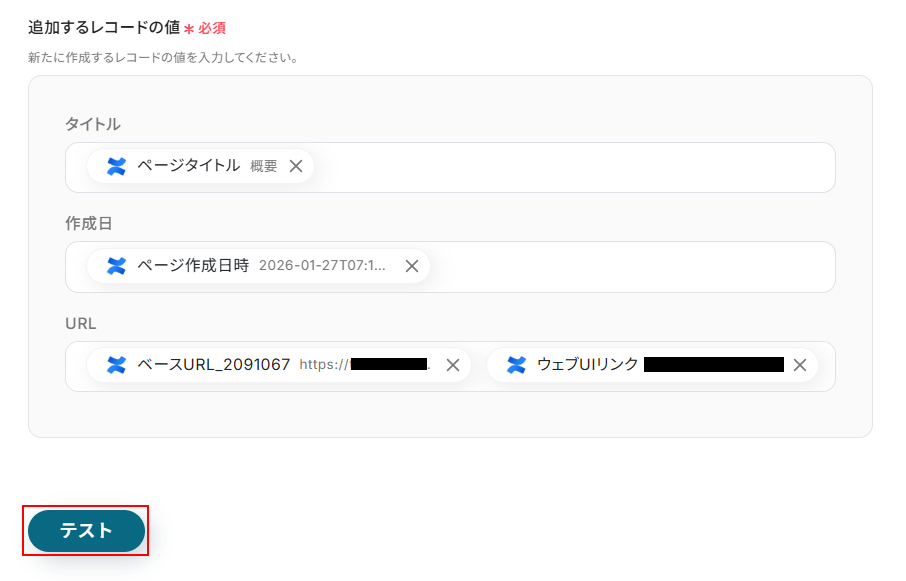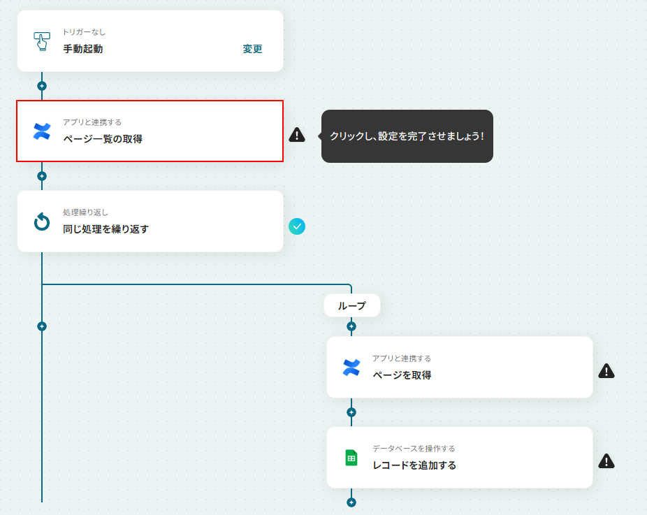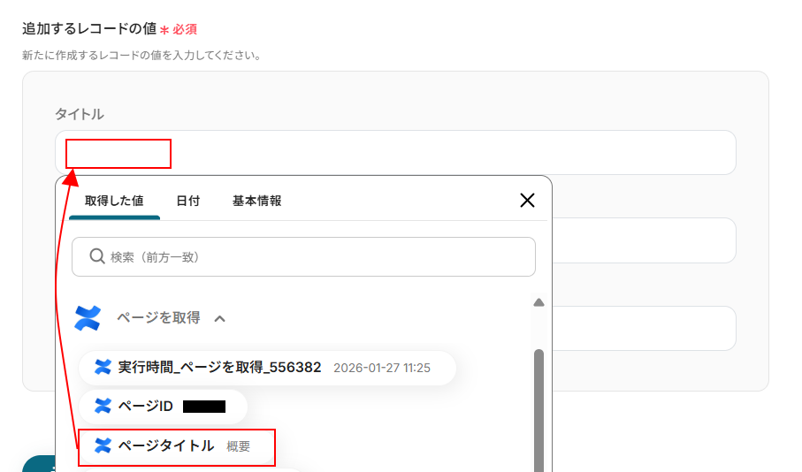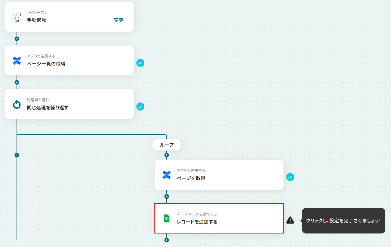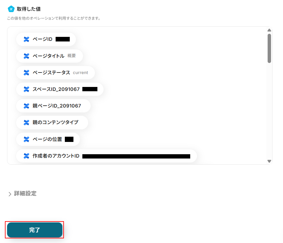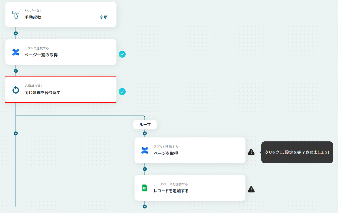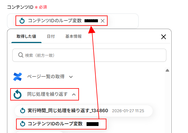 - ループ機能では、前段のConfluenceから取得したページ一覧の情報の中から、繰り返し処理を行いたい項目を任意で設定してください。
