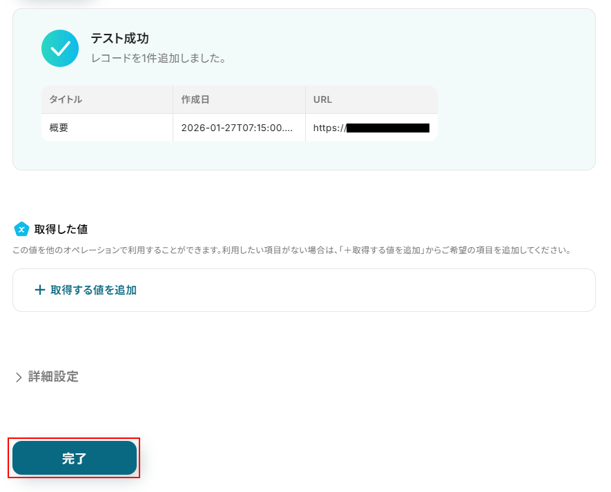 新しく値を追加したい場合は、「+取得した値を追加」をクリックし、設定を行ってください。