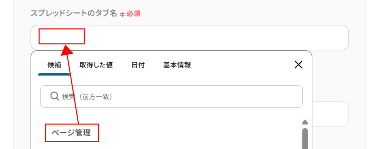 ※入力欄に直接記入する、もしくはプルダウンメニューから選ぶと、入力した値や選択した値が固定値となり、このテンプレートを通して行う全てのページ一覧の取得設定に適用されますのでご注意ください。