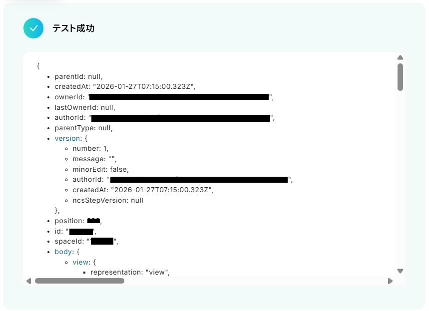 - Confluenceでページを作成するアクションでは、ページの作成先となるクラウドIDやスペースID、ページのステータスなどを任意で設定してください。