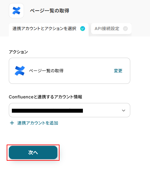 - 次に、オペレーションでConfluenceの「ページ一覧の取得」アクションを設定します。