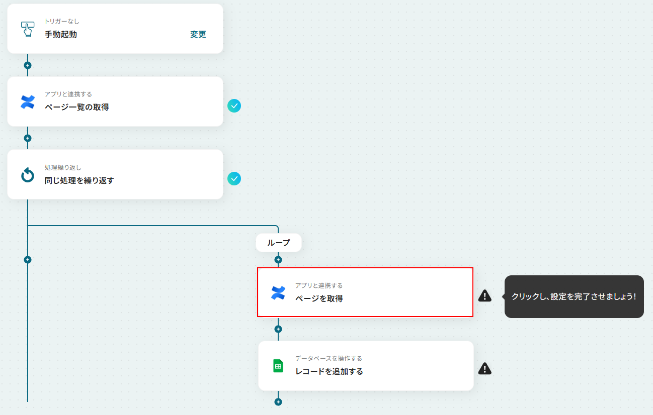 - ループ処理の中で、Confluenceの「ページを取得」アクションを設定し、各ページの詳細情報を取得します。