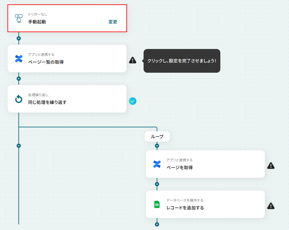 - 手動起動トリガーとConfluence・同じ処理を繰り返す・Google スプレッドシートのアクションの設定