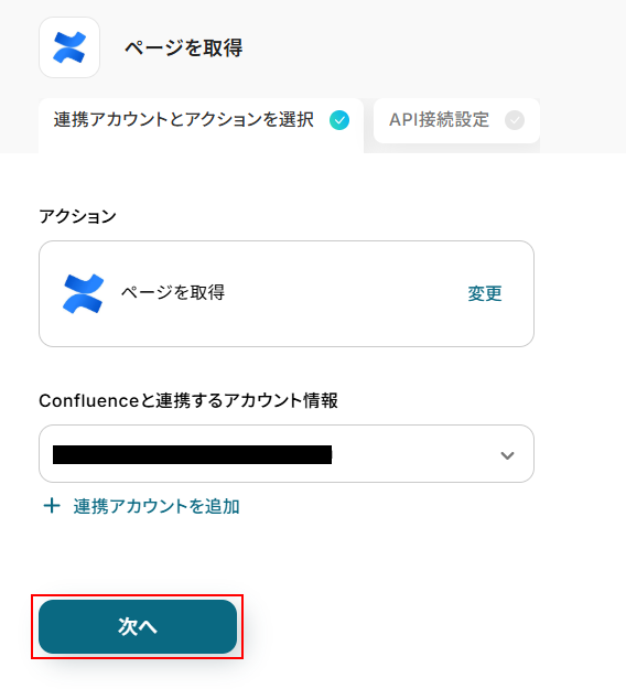 - 次に、オペレーションでConfluenceの「ページを取得」アクションを設定し、作成されたページ情報を取得します。