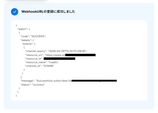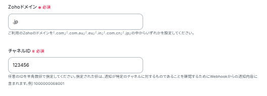まず、脚注を参考にZohoドメインとチャネルIDを入力し、「WebhookURLを登録」をクリック。