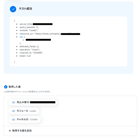 ステップ4と同様に、Zohoドメインと取得した値から見込み客IDを入力します。