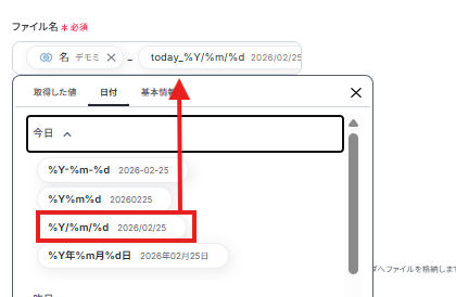 取得した値から顧客名を引用したり、候補から日付を選んでファイル名を作成できます。