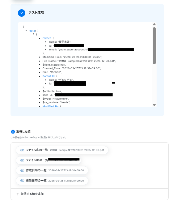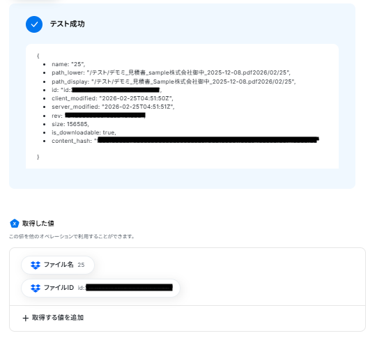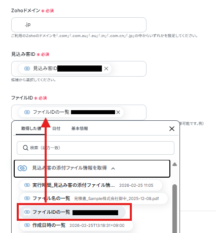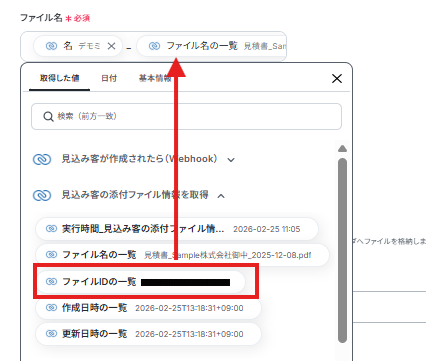 ファイルIDは、添付ファイル情報から取得した値を引用します。