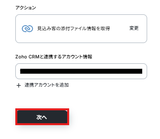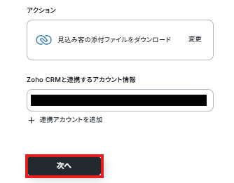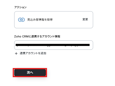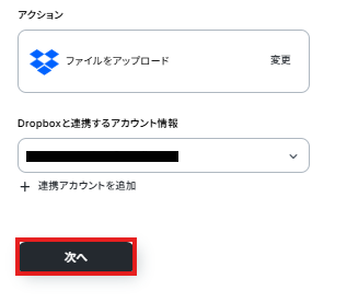 アクションは変更せず、アカウント情報がマイアプリ連携をしたアカウントと一致することを確認したら、「次へ」をクリック。