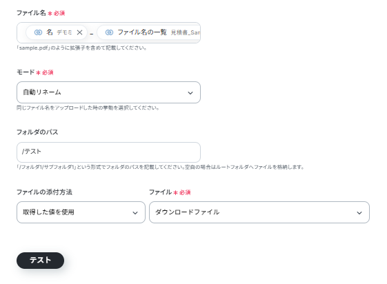 以下のように登録しました。また今回は添付ファイルをDropboxに保存するフローなので、添付ファイルを忘れずに添付してください。