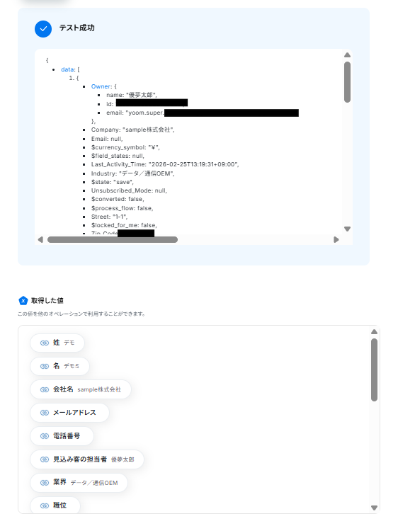 ステップ5と同様にZohoドメインと見込み客IDを入力します。