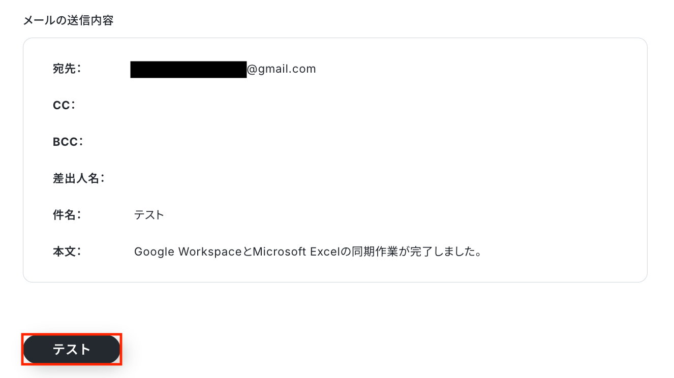 送信先・件名・本文などが正しく設定されているか確認したら「テスト」をクリックして、実際に設定した内容でメールが届くかを確認しましょう。