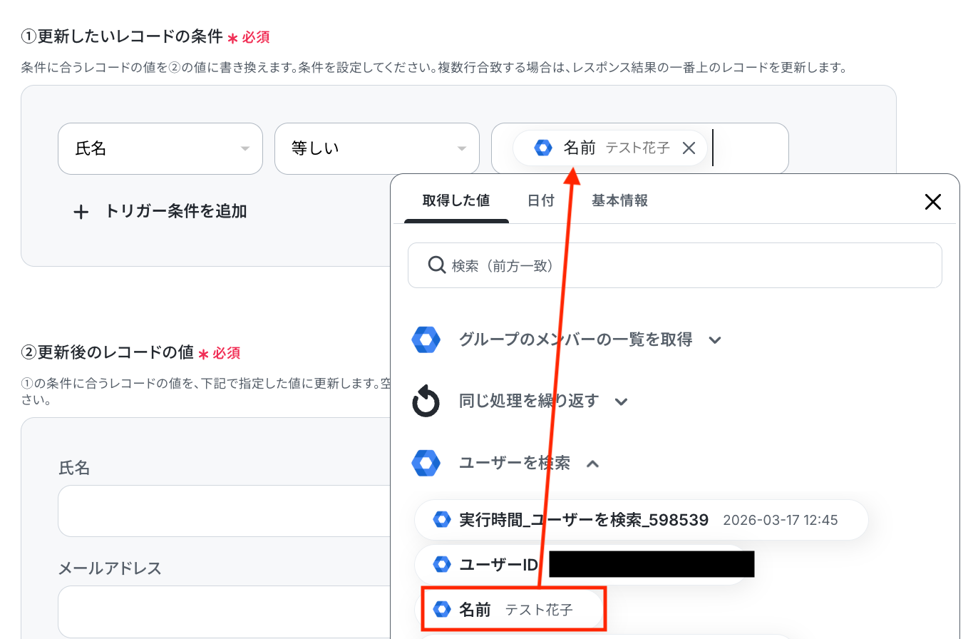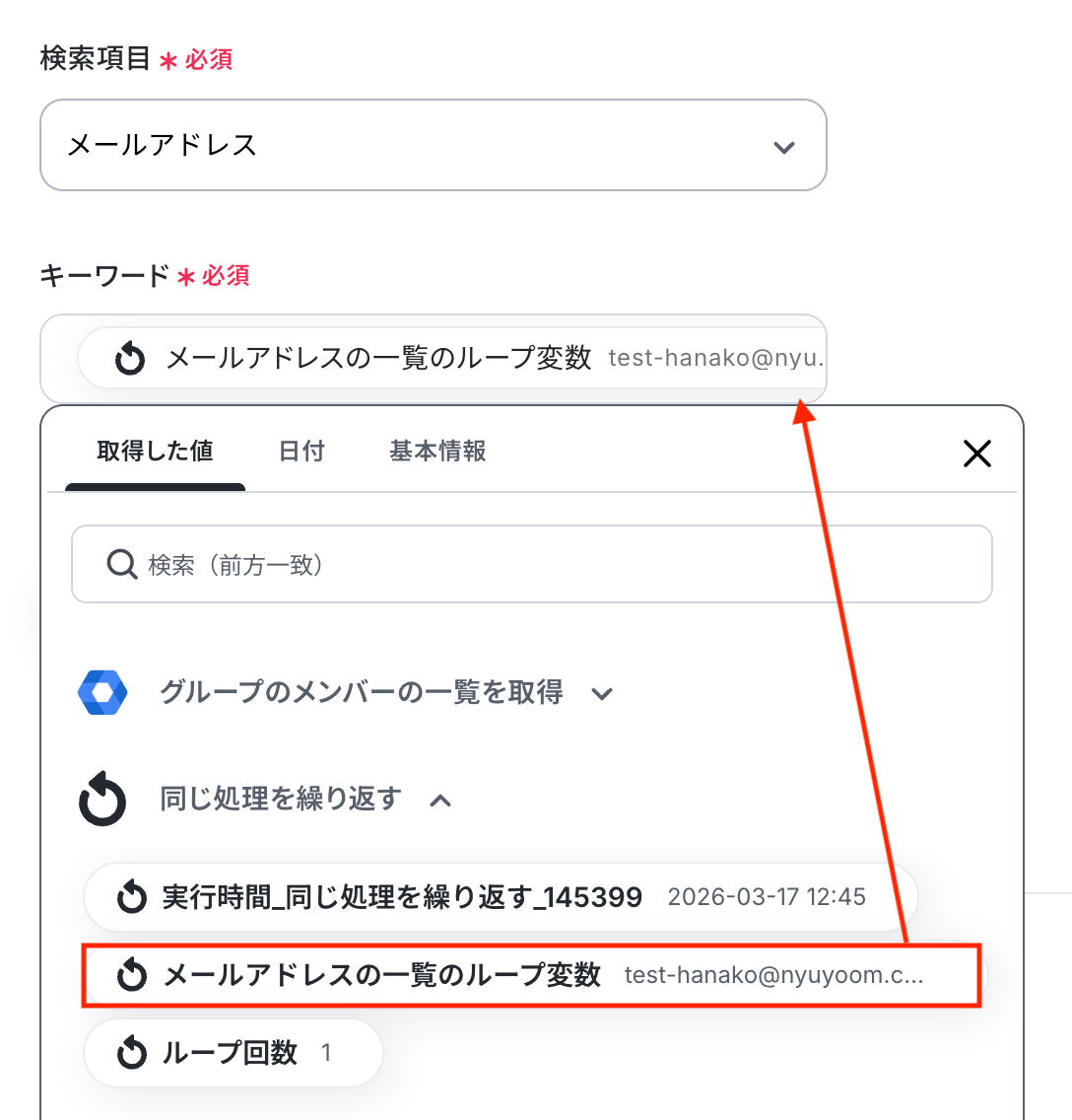 検索項目 プルダウンから該当の検索項目を選択してください。キーワード 入力欄をクリックすると、前のステップで取得した値が表示されるので、選択して入力しましょう。 入力が完了したら「テスト」をクリックして、設定した内容でユーザーが検索されるか確認しましょう。