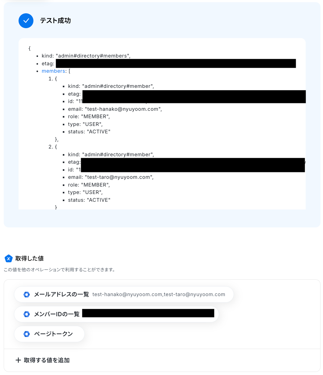 テストに成功すると、Google Workspaceから取得されたグループのメンバー一覧に関する情報が表示されます。 以下の取得した値はこの後のステップで利用できます。