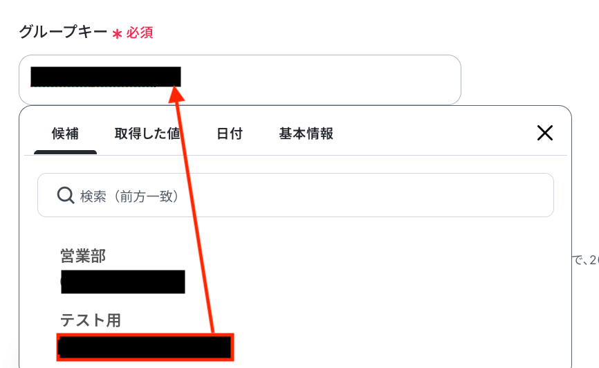 Yoomの操作画面に戻ります。グループキー 入力欄をクリックするとマイアプリ連携をしたアカウントから候補が表示されるので、対象の項目を選択しましょう。