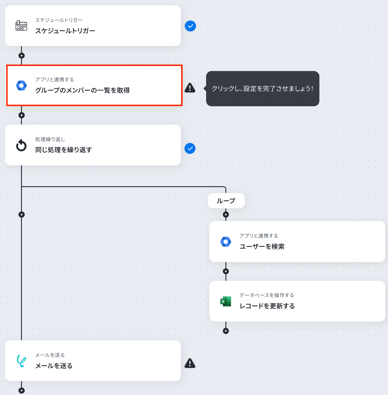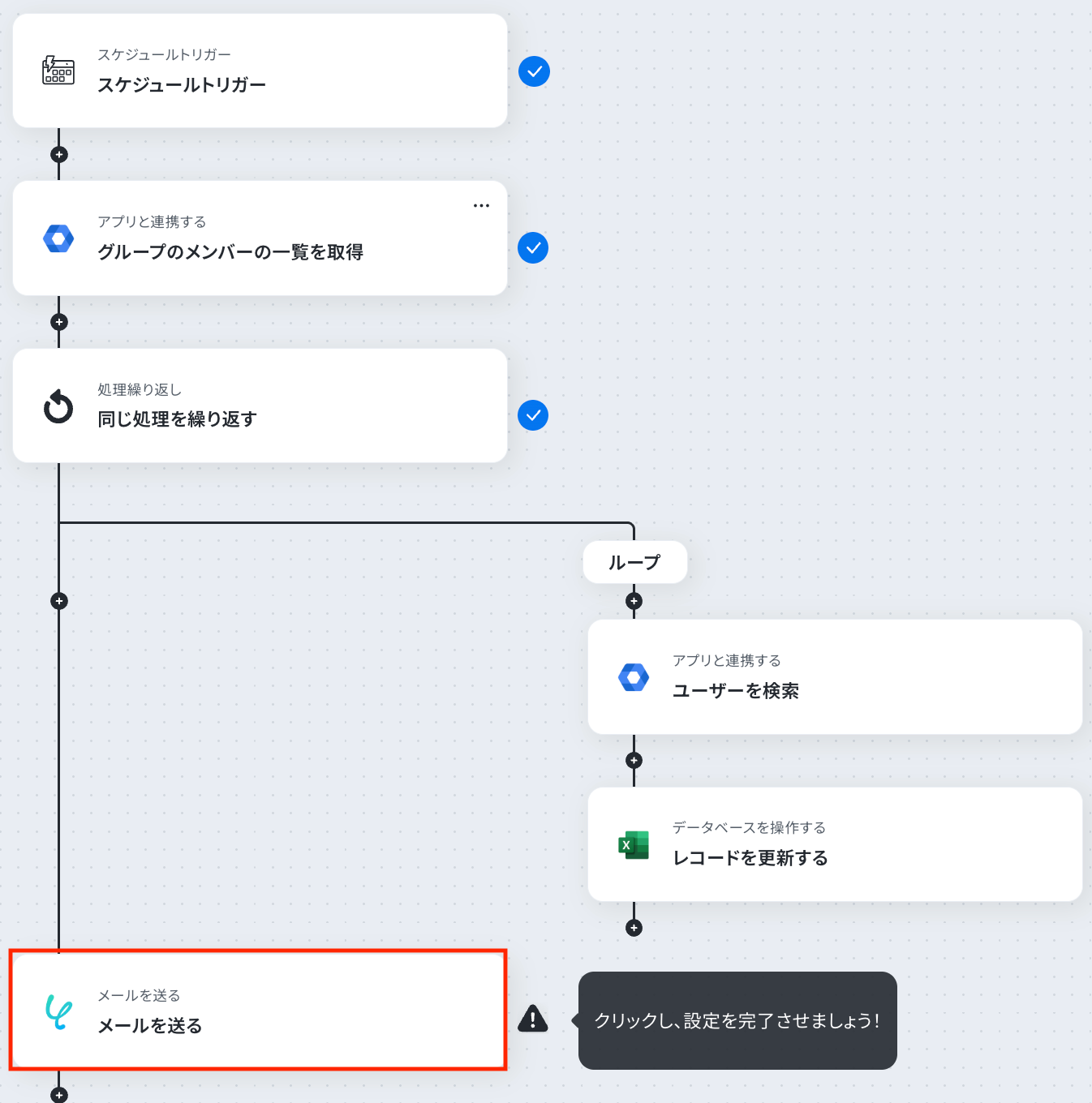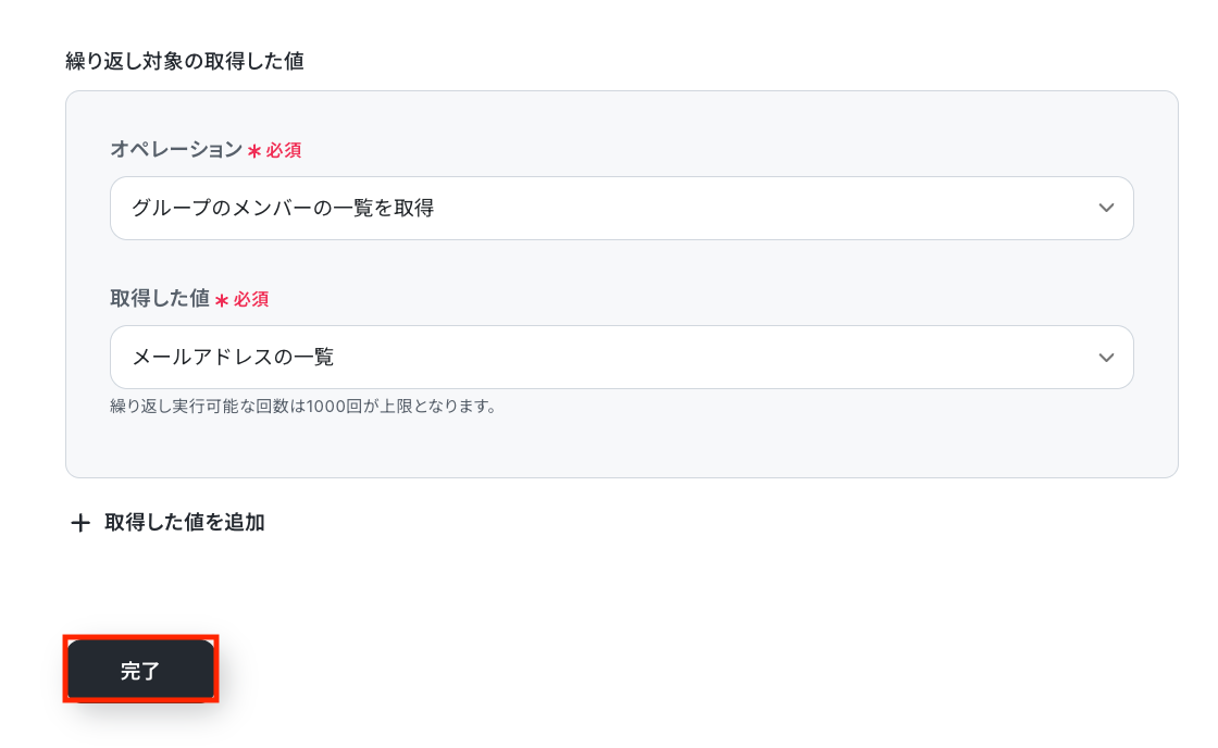 これにより、Google Workspaceのメンバー一覧から取得したメールアドレスが、順番に処理されるようになります。 設定後、「完了」をクリックしましょう。