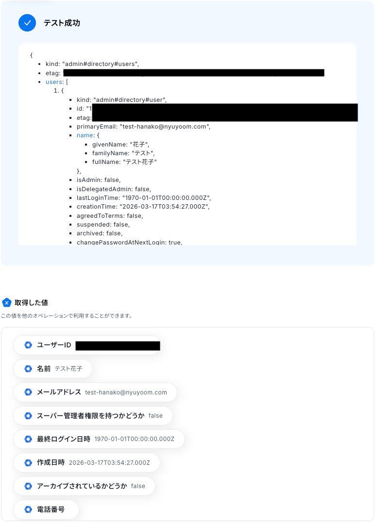 テストに成功すると、Google Workspaceで検索されたユーザー情報が表示されます。 以下の取得した値はこの後のステップで利用できます。