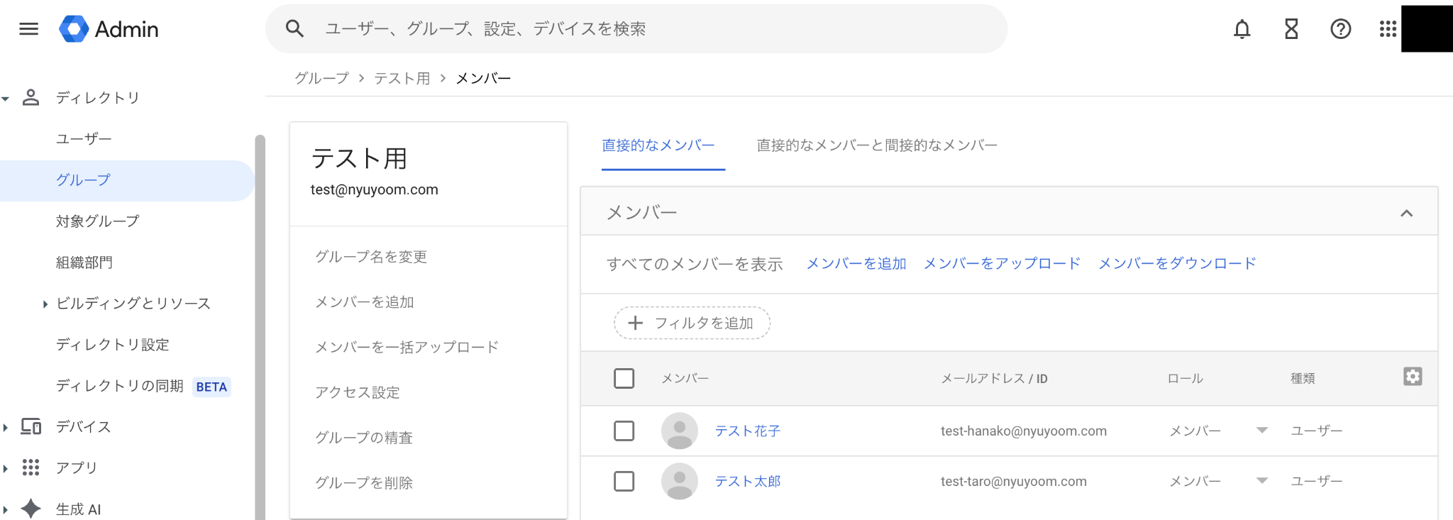 事前準備として、Google Workspaceでユーザーをグループに追加しておきましょう。 今回はテスト用に、以下の内容で追加しました。