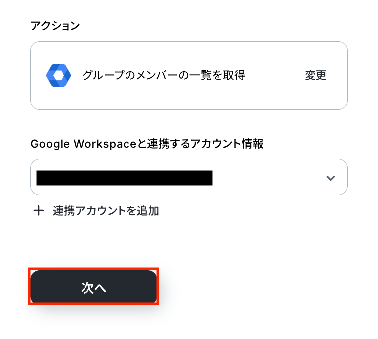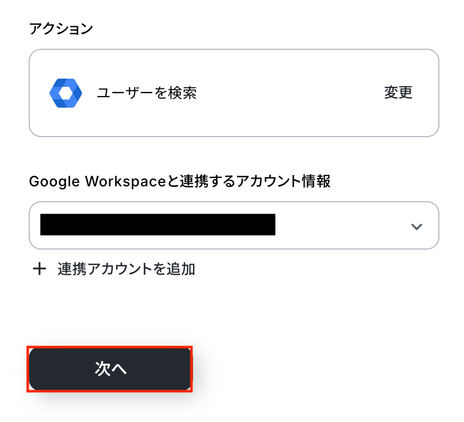 アクションはあらかじめ設定されているため、そのまま内容を確認してください。 Google Workspaceと連携するアカウント情報に問題がなければ、「次へ」をクリックします。