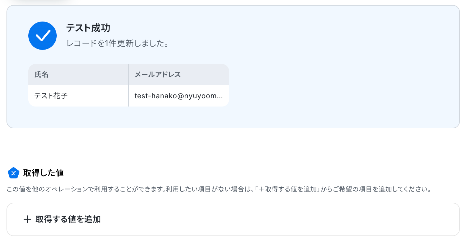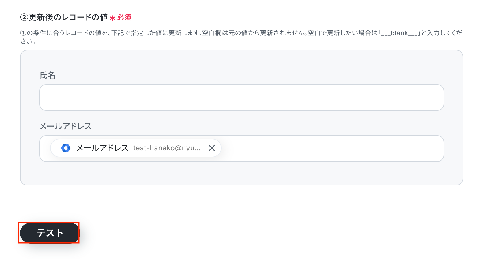 それぞれの項目について入力が完了したら、「テスト」をクリックして、設定した内容でMicrosoft Excelでレコードが更新されるか確認しましょう。 (更新しない行については空白で問題ありません)