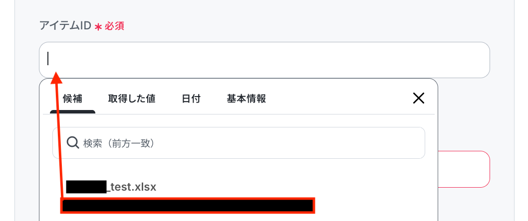 入力欄をクリックするとマイアプリ連携をしたアカウントから候補が表示されるので、対象の項目を選択しましょう。