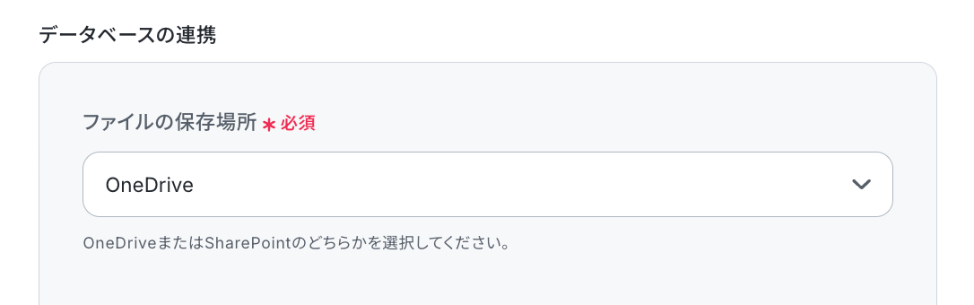 Yoomの操作画面に戻り、連携するデータベースを設定しましょう。ファイルの保存場所 デフォルトでOneDriveが設定されているので確認してください。