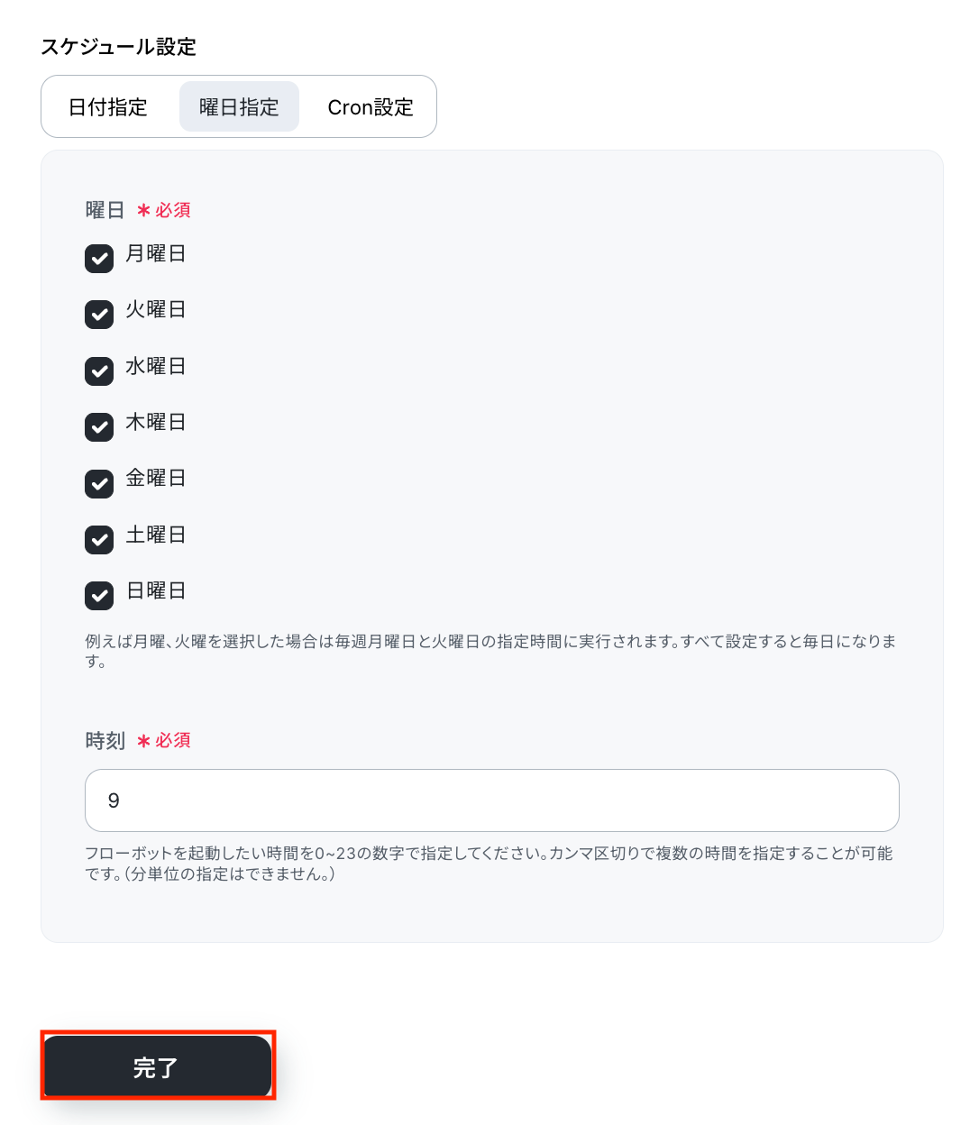 今回は、毎日朝9時にフローボットを実行するよう以下のスケジュールを設定しています。